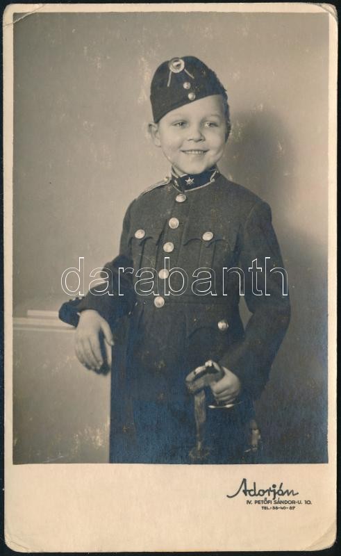 Leírás: cca 1940 Gyerekkatona, karddal és bocskai sapkával, fotólap, Bp., Adorján, 8x13 cm. Ritka!