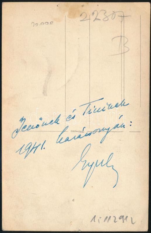 Leírás: cca 1941 Lelkész portréja, kitüntetésekkel, (német háborús elismerések, nemzetvédelmi kereszt), a hátoldalon ajándékozási sorokkal, 13x8 cm