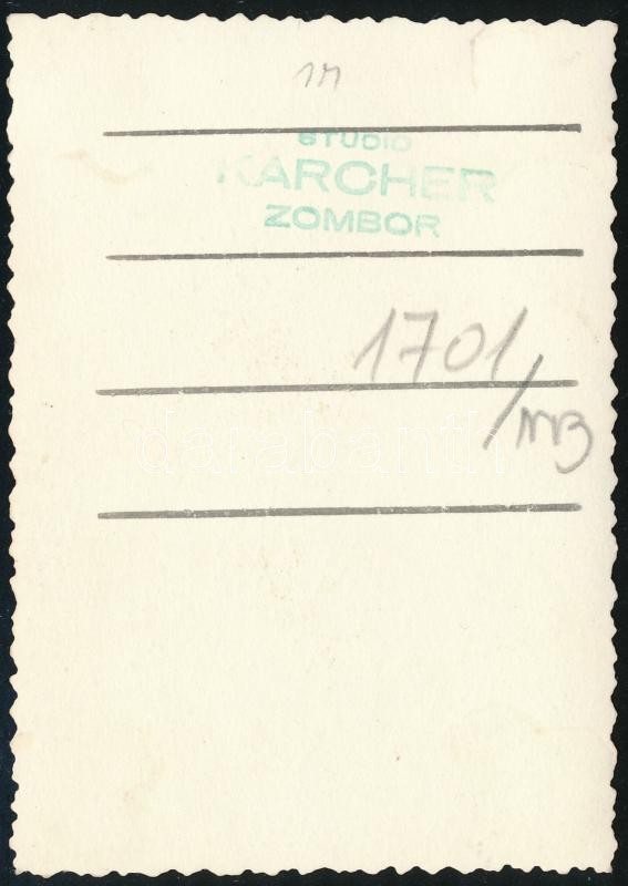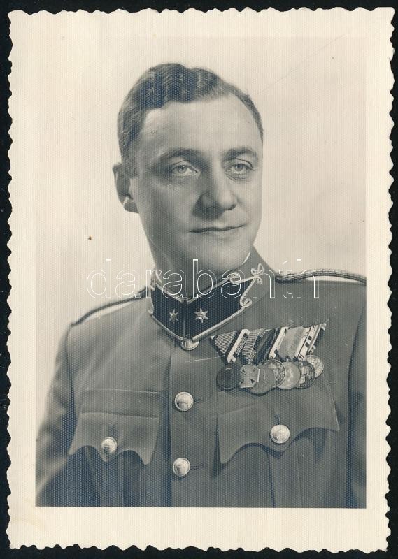 Leírás: cca 1941 Tartalékos hadnagy portréfényképe, első világháborús kitüntetésekkel, Zombor, Studio Karcher pecséttel a hátoldalán, 8x6 cm