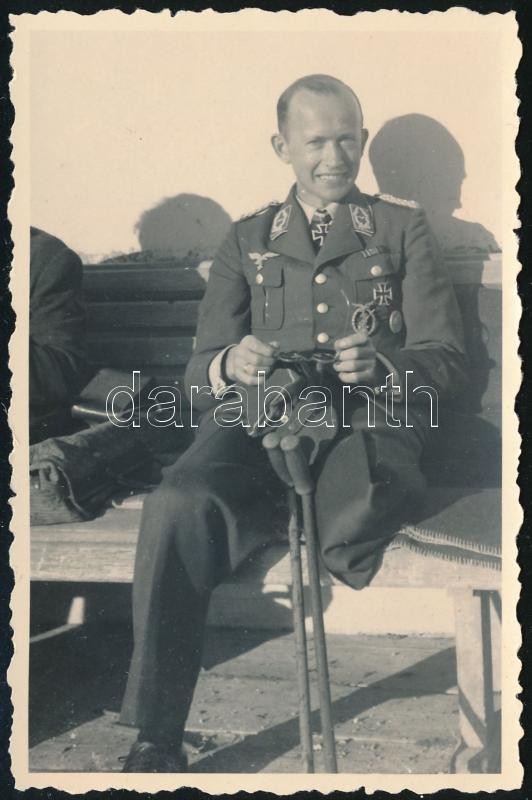 cca 1945 Wilhelm Weissberg (1914-2006) német légvédelmi őrnagy, amputált lábbal, kitüntetésekkel, vaskereszt lovagkeresztjével, arany sebesülési jelvénnyel, 8x5 cm