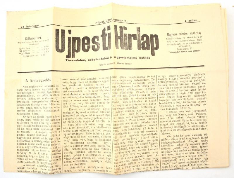 1900 Az Ujpesti Hírlap II. évf. 1. száma https://www.darabanth.com/hu/367-Gyorsarveres/367.0/Mutargy-papirregiseg-egyeb/Nyomtatvanyok~31/1900-Az-Ujpesti-Hirlap-II-evf-1-szama~II2130065