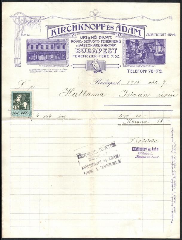 Leírás: 1915 Kirchknopf és Ádám ruhanemű árú fejléces számla