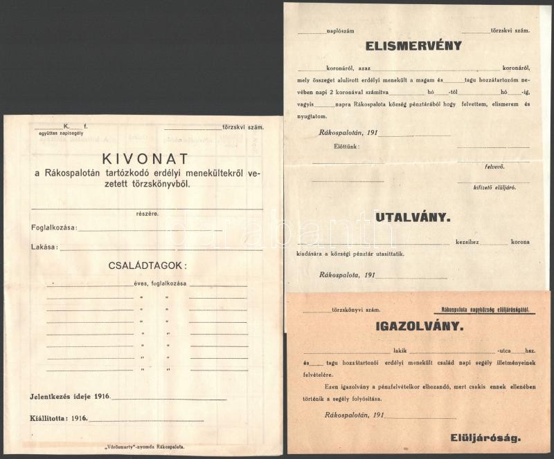 Leírás: 1916 A román betörés miatti erdélyi menekültek adminisztrálására szolgáló 3 nyomtatvány Rákospalotáról