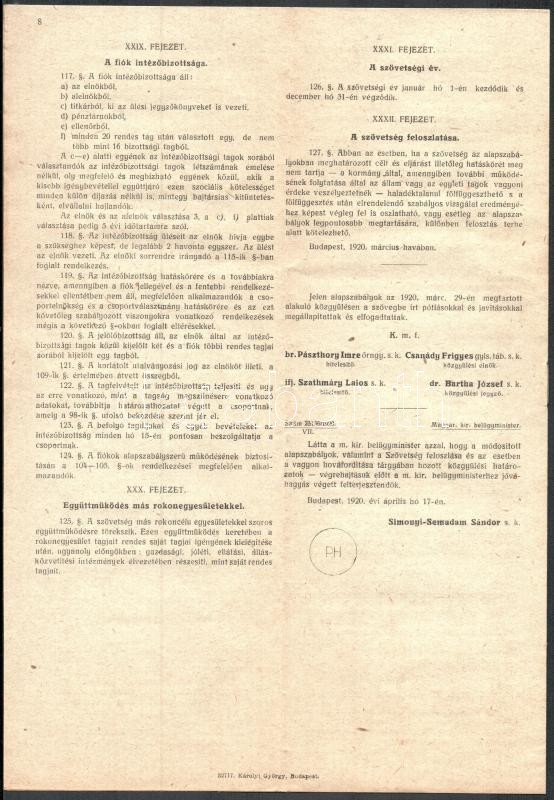 Leírás: 1916 Hadirokkantak, Hadiözvegyek és Hadiárvák Nemzeti Szövetségének alapszabályai 8p.