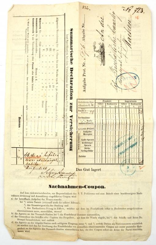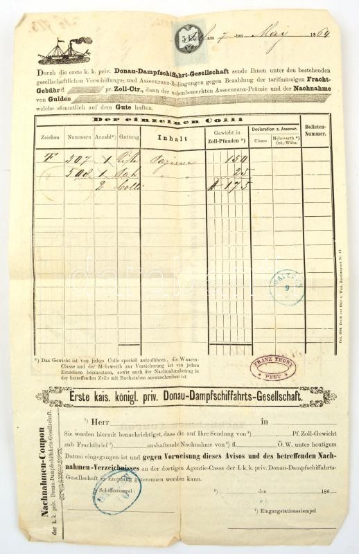 Leírás: 1864 DDSG fuvarlevél a Waitzen hajó pecsétjével