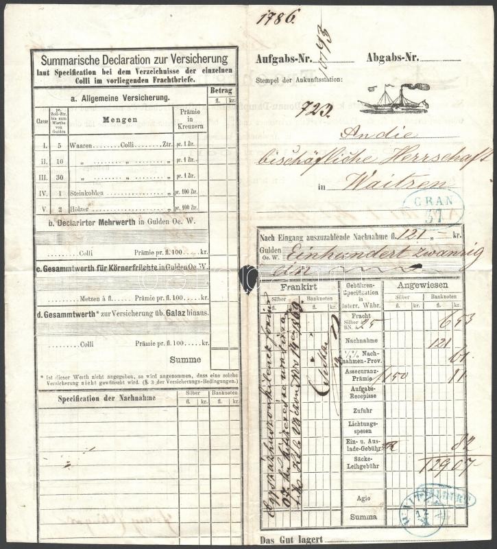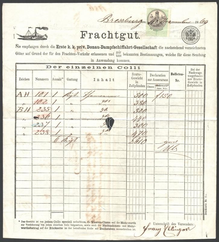 Leírás: 1869 DDSG Gran hajó fuvarlevele