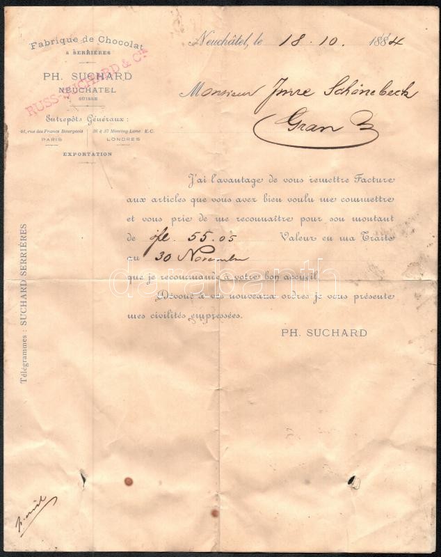 1884 Neuchatel,Fabrique de Chocolat Ph. Suchard, Suchard csokoládégyár fejléces, francia nyelvű, kétoldalas számlája, esztergomi lakos részére, foltos.
