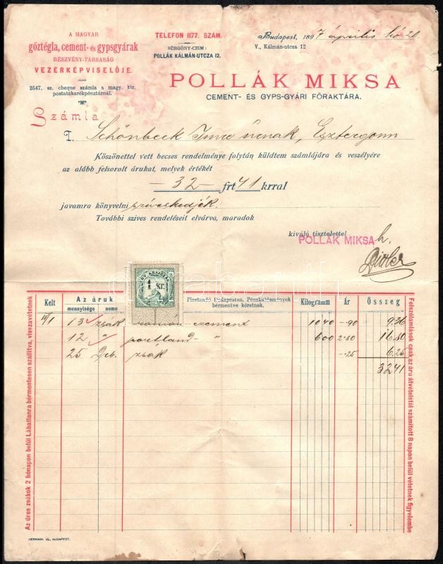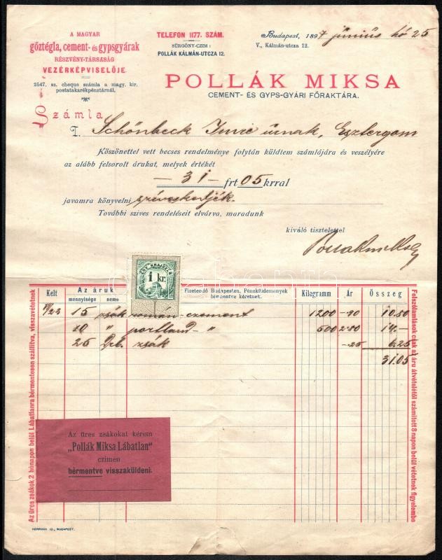1897 Bp., Pollák Miksa Cement- és Gyps-Gyári Főraktárának fejléces számlája, 2 db, 2 db 1 Kr. okmánybélyeggel, esztergomi lakos részére, az egyiken folttal, a másikon kis szakadással.