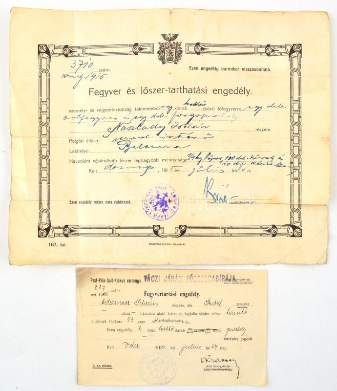 1915 Fegyver és lőszer tarthatási engedély, 1920 Fegyvertartási engedé... https://www.darabanth.com/hu/367-Gyorsarveres/367.0/Mutargy-papirregiseg-egyeb/Okmanyok~18/1915-Fegyver-es-loszer-tarthatasi-engedely-1920-Fegyvertartasi-engedely~II2129375