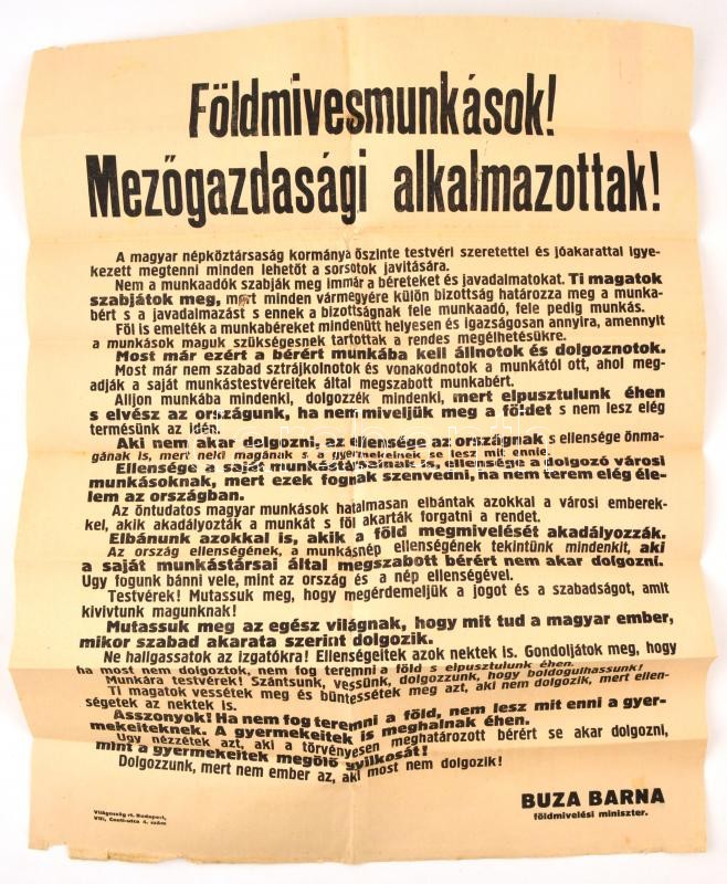 Leírás: 1918 Az Őszirózsás forradalom földművelésügyi miniszterének hirdetménye a parasztsághoz, melyben a munka felvételére hív fel. 50x62 cm