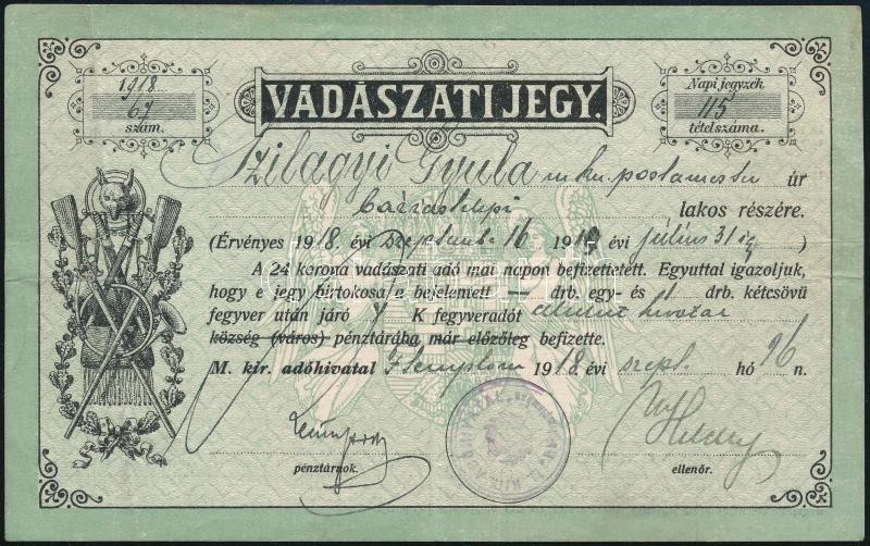Leírás: 1918 Vadászjegy / vadászati jegy