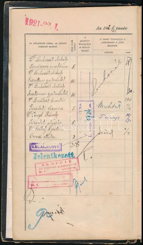 Leírás: 1921 Bp., A Budapesti Magyar Tudományegyetem leckekönyve, benne Lenhossék, Bókay, Korányi, stb. aláírásával