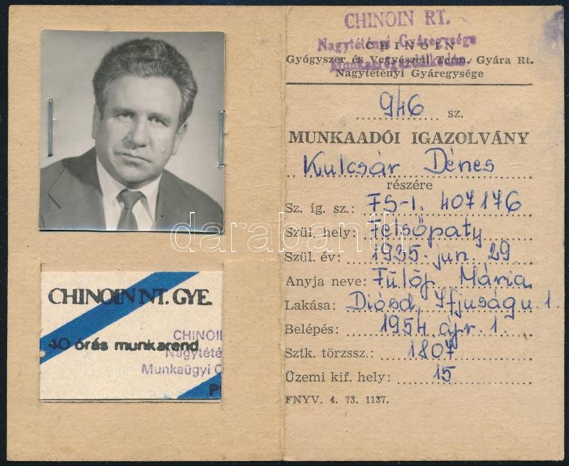 1954 a Chinoin Rt. fényképes munkaadói igazolványa https://www.darabanth.com/hu/367-Gyorsarveres/367.0/Mutargy-papirregiseg-egyeb/Okmanyok~18/1954-a-Chinoin-Rt-fenykepes-munkaadoi-igazolvanya~II2021097