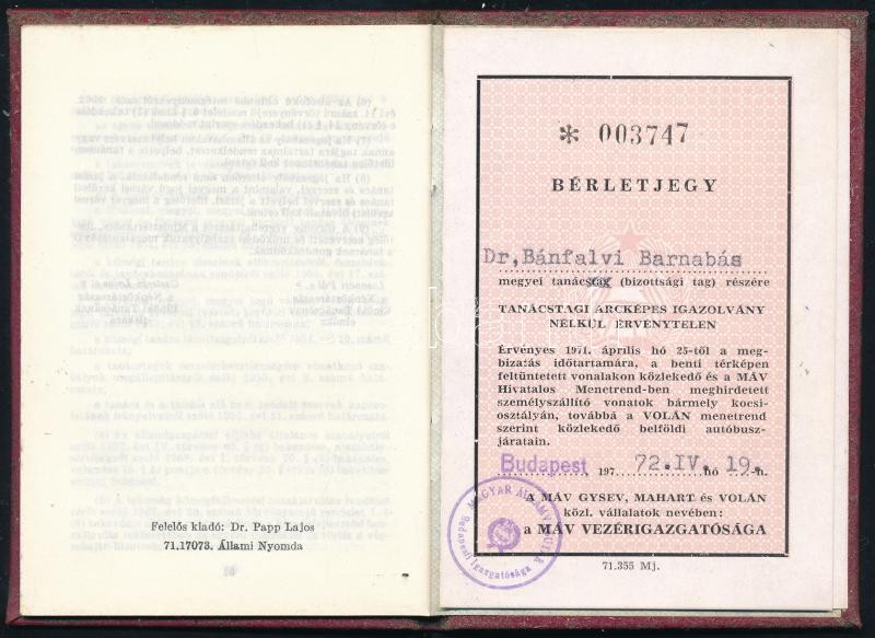 Leírás: 1972 Bp., Fényképes tanácstagi igazolvány