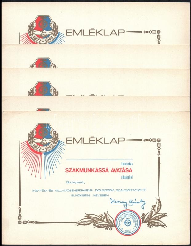 Leírás: 5 db Vas-, Fém és Villamos energiaipari Dolgozók Szakszervezetének 5 db kitöltetlen szakmunkás emléklap