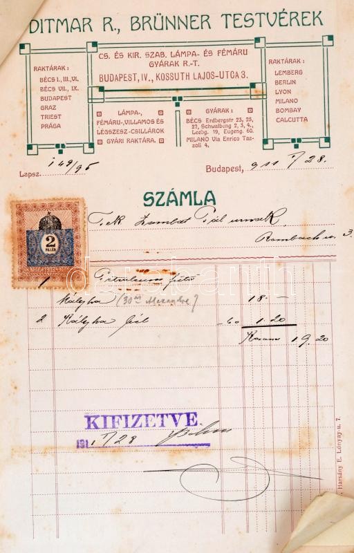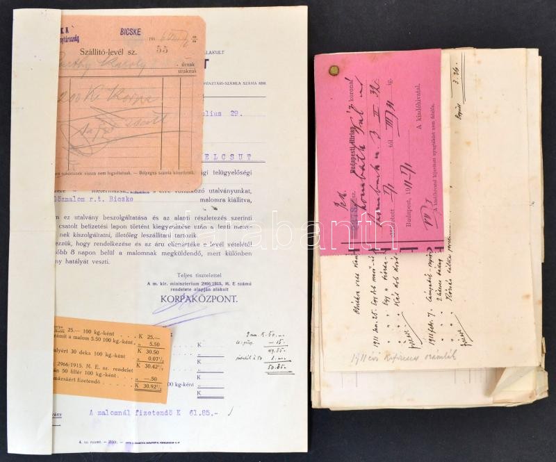 1911 Számlagyűjtemény, közte: Ditmar R., Brünner testvérek, Édeskuty L. Ásványvíznagykereskedő, Keller Szilárd vas, fűszer, festék, anyag és liszt kereskedő, Goldstein Márkusz fakerekedő, jegyzetekkel, szelvényekkel. +1916 Korpaközpont számlája