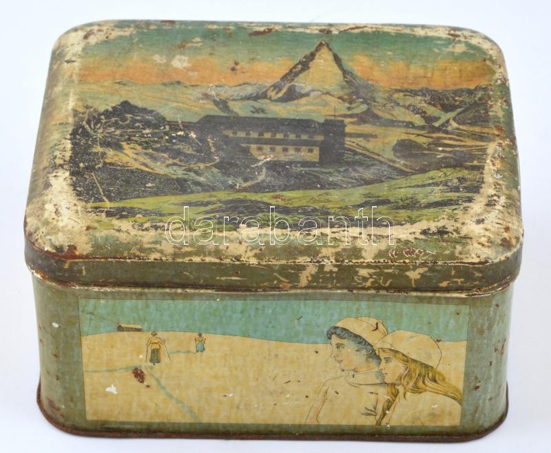 Leírás: cca 1900-1910 A. Egger's Sohn, K. u. K. Hoflieferant, Wien, festett fém lemezdoboz, kopott, rozsdás, 20x16x10 cm