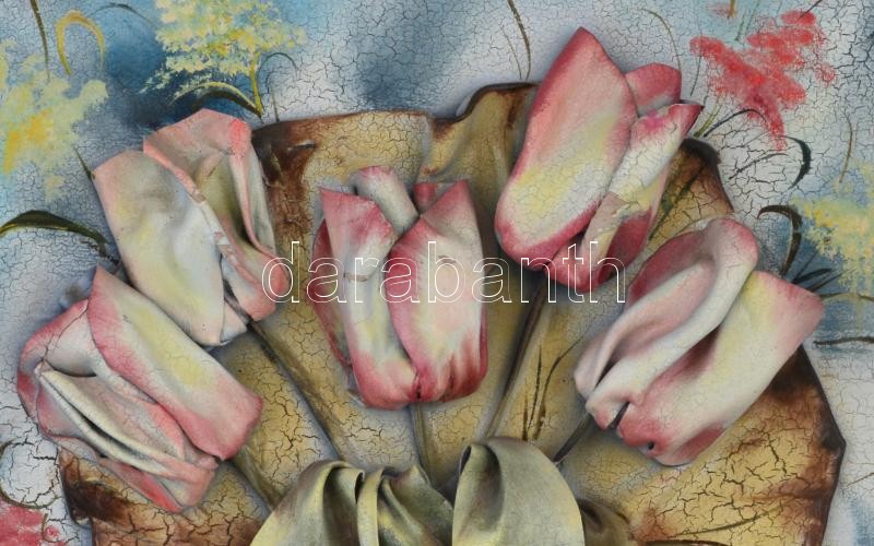 Leírás: Jelzés nélkül: Virágcsokor. Bőrplasztika. Kis sérülésekkel 55x45 cm Keretben