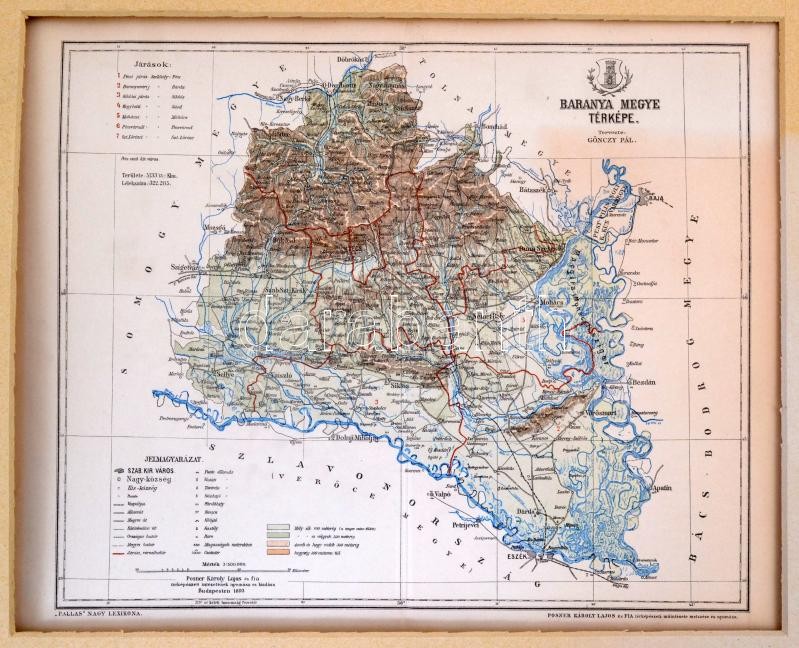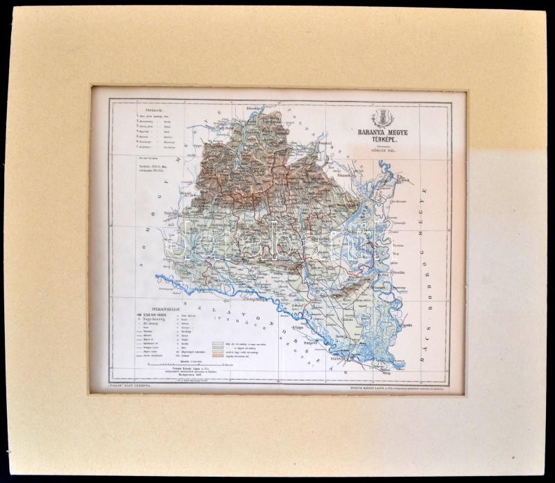 Leírás: 1893 Baranya vármegye térképe,1:500.000, tervezte: Gönczy Pál, Pallas Nagy Lexikona, Bp., Posner, paszpartuban, 24x30 cm