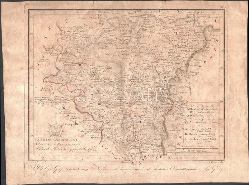 Leírás: cca 1805 Sáros vármegye térképe a Görög-Kerekes atlaszból, hajtásnyommal 27x36 cm