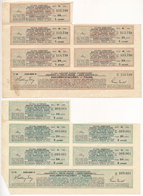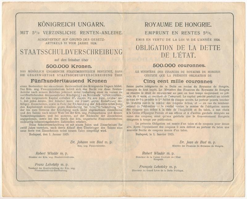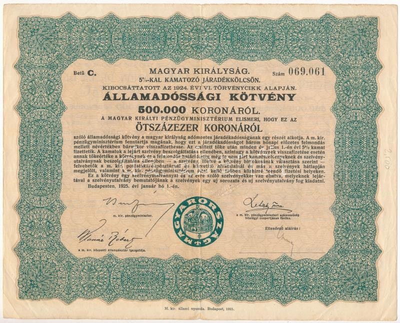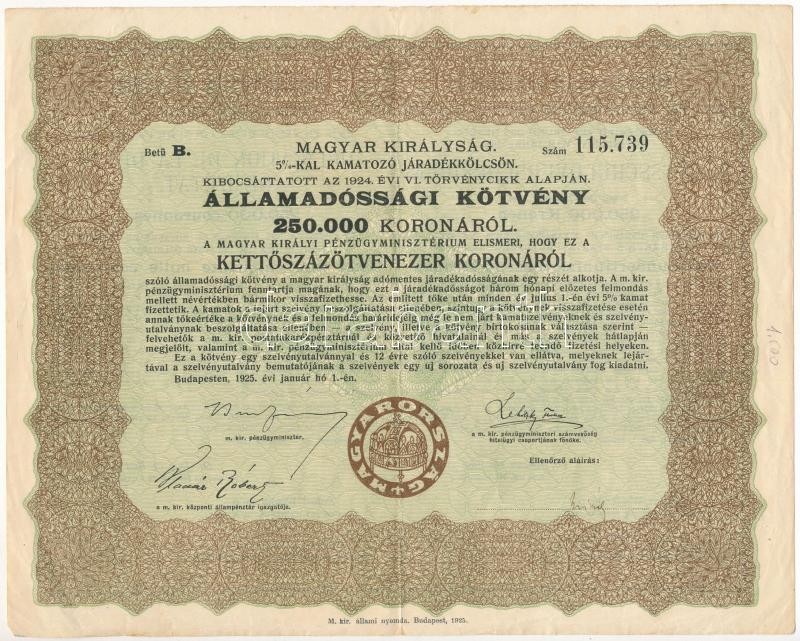Budapest 1925. "Magyar Királyság 5%-kal kamatozó járadékkölcsön" államadóssági kötvénye 250.000K-ról és 500.000K-ról magyar, német és francia nyelven, szelvényekkel T:III