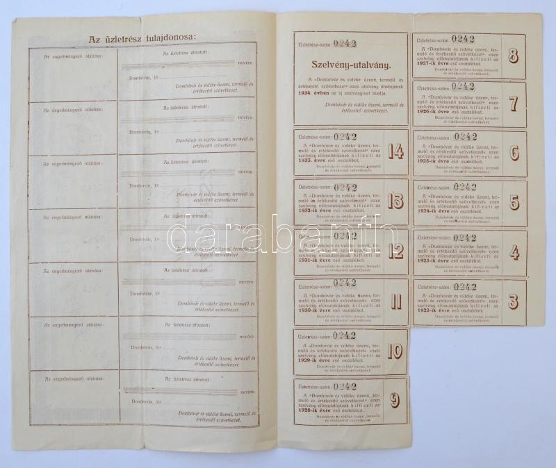 Dombóvár 1920. "Dombóvár és vidéke üzemi, termelő és értékesítő szövet... https://www.darabanth.com/hu/367-Gyorsarveres/367.0/Numizmatika/Reszvenyek-es-sorsjegyek~2000005/Dombovar-1920-Dombovar-es-videke-uzemi-termelo-es-ertekesito-szovetkezetuzletres~II2125932