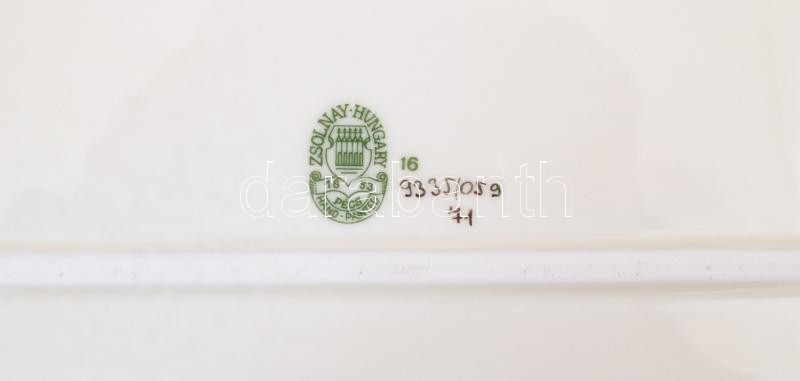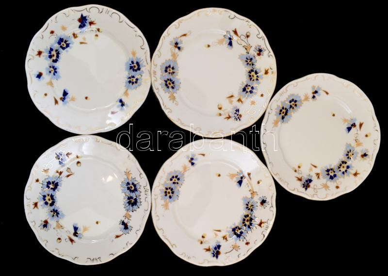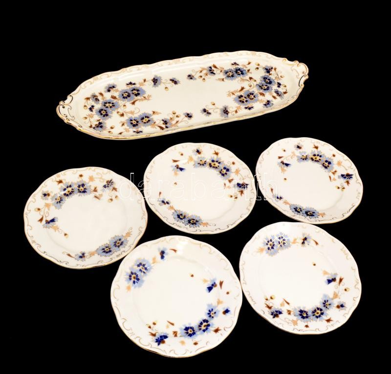 Leírás: Zsolnay búzavirág mintás süteményes készlet egy tányér hiánnyal. Kézzel festett, jelzett, kopott d: 17 cm, 46x20 cm