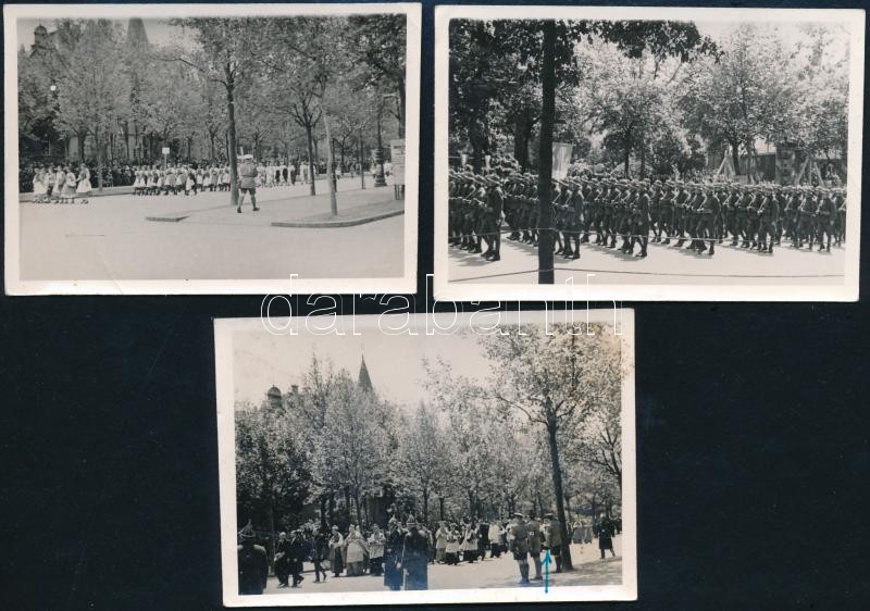 1938 Az Eucharisztikus Világkongresszus eseményein készült budapesti, hátoldalán feliratozott fotók, 3 db: Magyarruhás lányok, törésnyommal. Díszszázad a körmenetben, törésnyommal. Bíborosok a menetben, nyíllal jelzett feltehetően Serédi Jusztinián hercegprímás, foltos. Mind 6,5×9 cm méretben