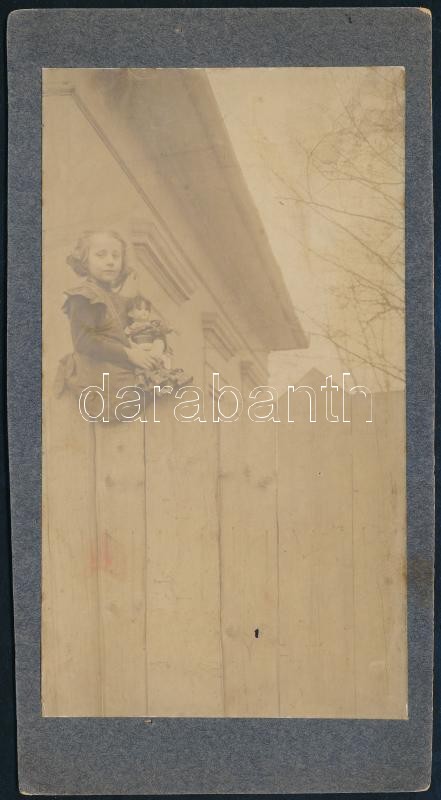 Leírás: cca 1910-1920 Kislány kerítésen babával a kezében, kartonra kasírozott fotó, 20×10,5 cm