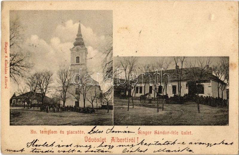 Leírás: 1901 Alberti (Albertirsa), Evangélikus templom, Piac tér, Singer Sándor féle üzlet és saját kiadása (fl)