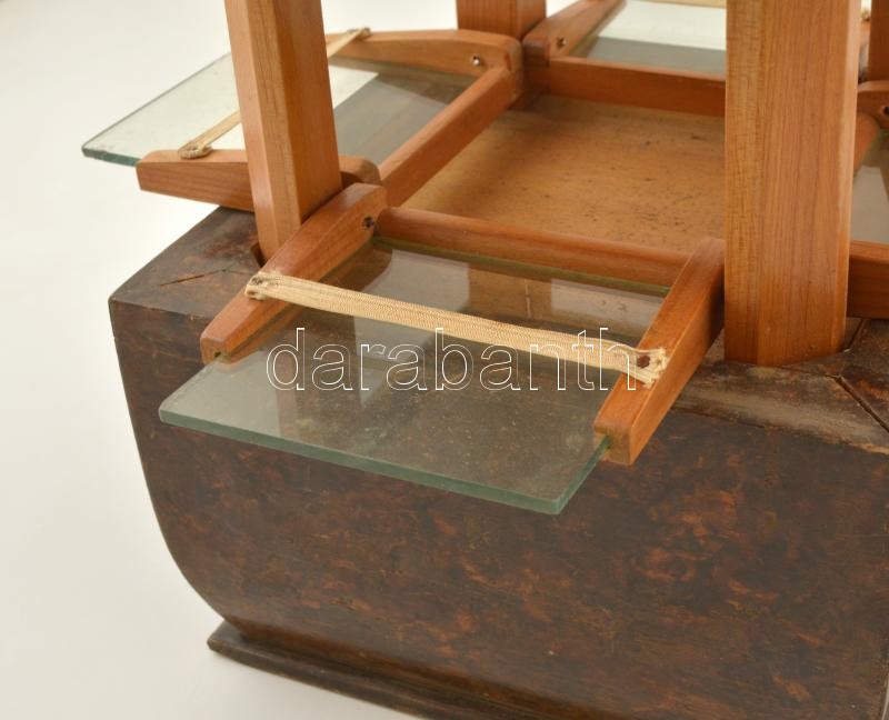 Leírás: Fölfele nyíló fa doboz, üveglapokkal, kis repedésekkel, apró lepattanással, 17,5×17,5 cm