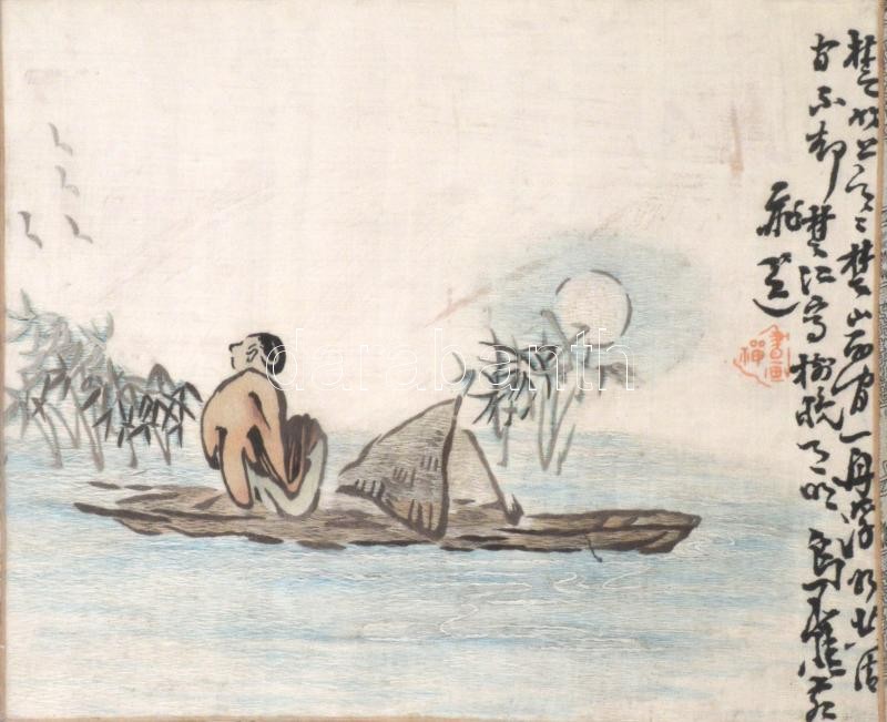 Leírás: Távol-keleti selyemkép, paszpartu bal oldala foltos, üvegezett fa keretben, 33×39 cm