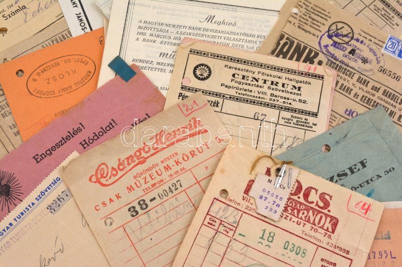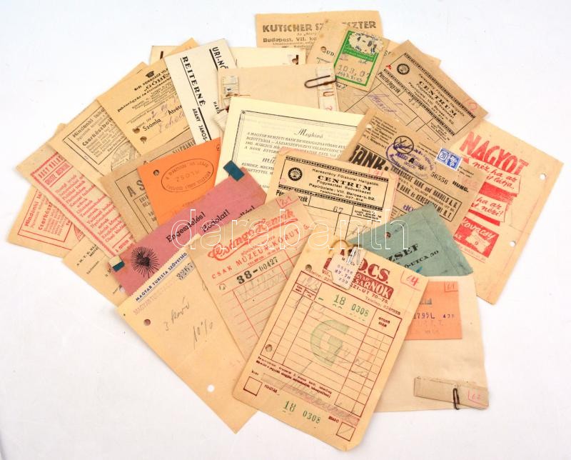 Leírás: Vegyes nyugta tétel (Magyar Turista Szövetség, Plascsevics János asztalos, Fehér József Töltőtollüzeme, stb.)