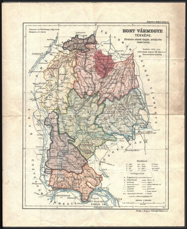 Hont vármegye térképe, átdolg.: Czakó István (Kogutowicz: Megyei térképek), 1:300000, Magyar Földrajzi Intézet Rt., hajtásnyomokkal, alján szakadásokkal, 34×24,5 cm