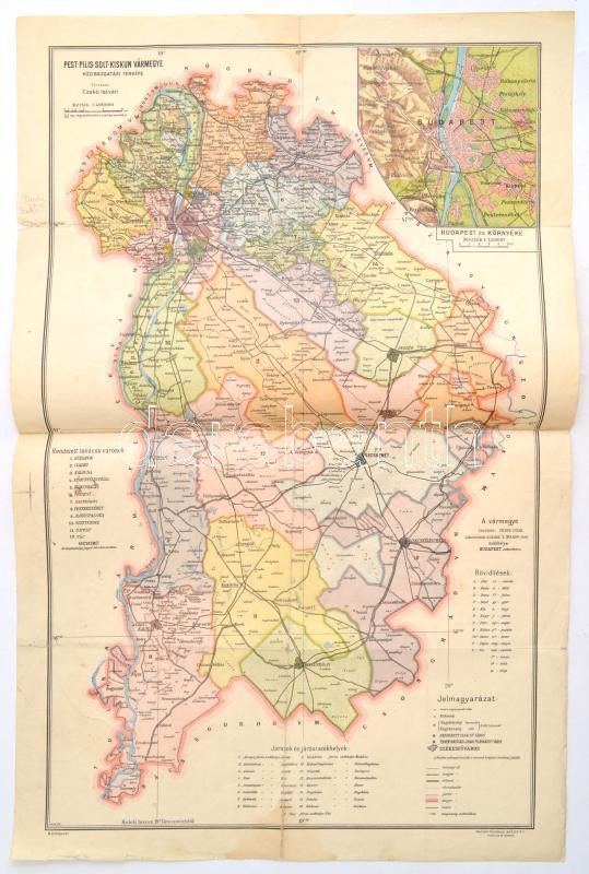 cca 1928-30 Pest-Pilis-Solt-Kiskun vármegye közigazgatási térképe, tervezte: Czakó István, Magyar Földrajzi Intézet Rt. metszése és nyomása, restaurált-ragasztott szakadásokkal, lap teteje és alja foltos, 1:400 000, 51,5x32 cm