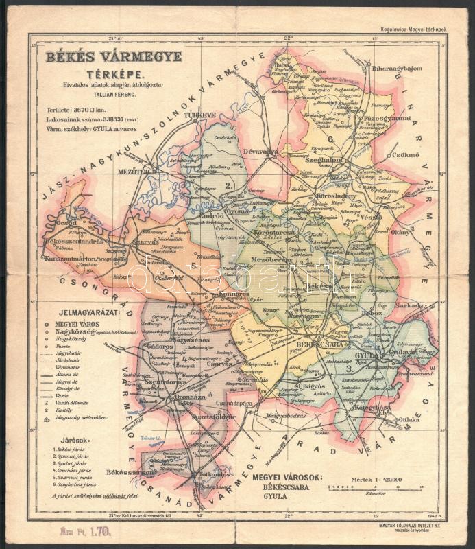 cca 1943-44 Békés vármegye térképe, átdolgozta Tallián Ferenc, restaur... https://www.darabanth.com/hu/368-Gyorsarveres/368.0/Mutargy-papirregiseg-egyeb/Terkepek~1000031/cca-1943-44-Bekes-varmegye-terkepe-atdolgozta-Tallian-Ferenc-restauralt-ragasztott-szakadC3~II2132408