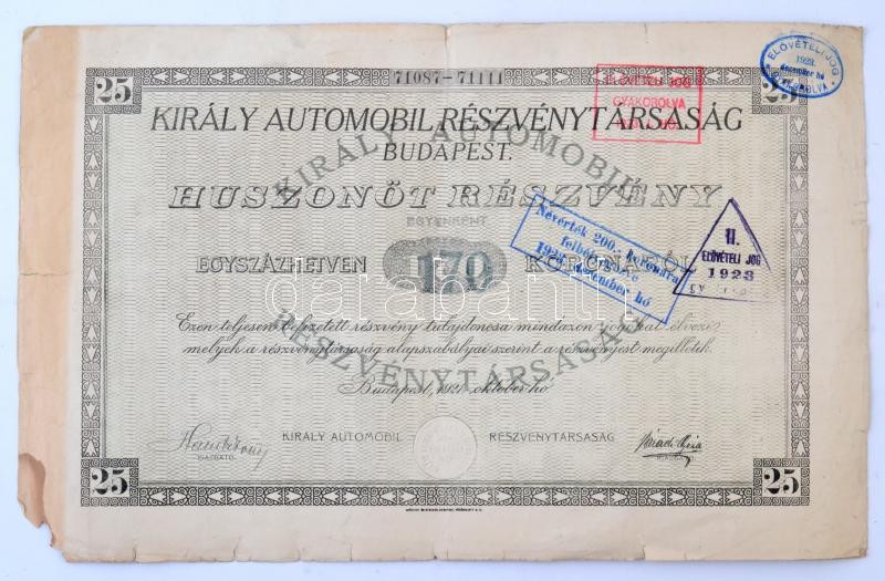 Budapest 1921. "Király Automobil Részvénytársaság" részvénye 200K-ról ... https://www.darabanth.com/hu/368-Gyorsarveres/368.0/Numizmatika/Reszvenyek-es-sorsjegyek~1500005/Budapest-1921-Kiraly-Automobil-Reszvenytarsasag-reszvenye-200K-rol-szelvenyekkel-szara~II2137513