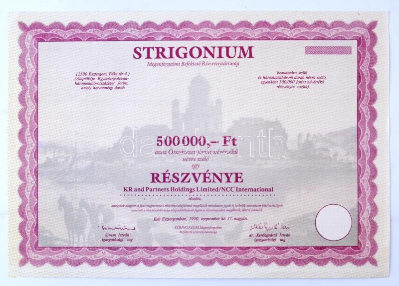 Leírás: Esztergom 1990. "Strigonium Idegenforgalmi Befektető Részvénytársaság" részvénye 500.000Ft-ról T:I-