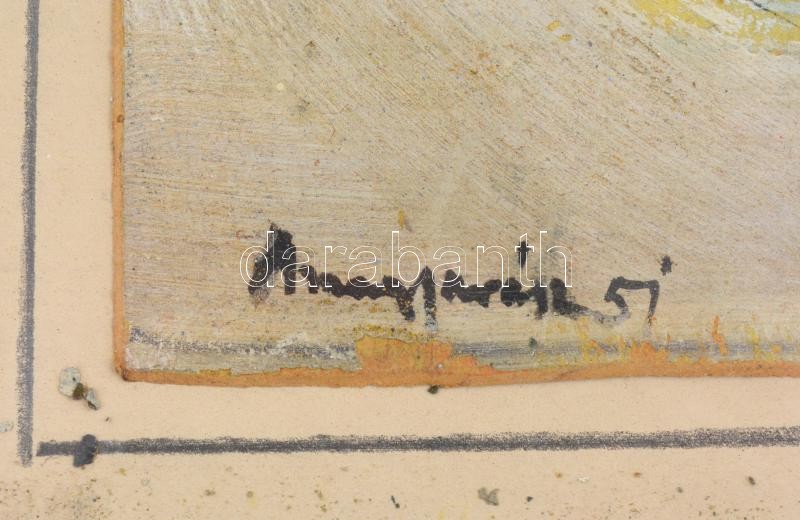 Leírás: Olvashatatlan jelzéssel: Kancsós csendélet. Vegyes technika, papír, festékhiánnyal, kartonra kasírozva, üvegezett, sérült fa keretben, 45,5×29 cm