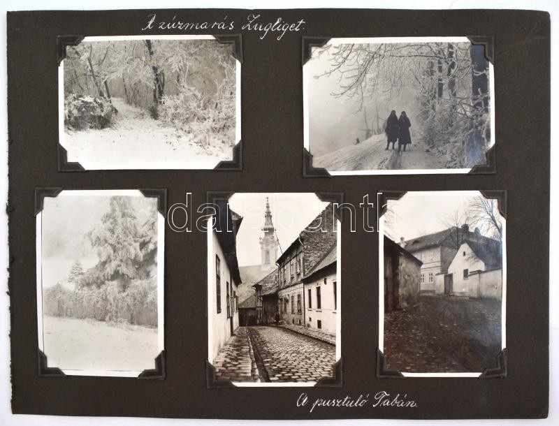 cca 1930. Budapest, Tabán/Zugliget, közte Holdvilág utca, Aranykacsa utca, 11 db fotó nagyrészt feliratozott kartonlapra ragasztva, különböző méretekben, 8x6,1 cm-től 6x8,7cm-ig