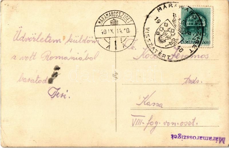 Leírás: 1940 Máramarossziget, Sighetu Marmatiei; bevonulás, lovas katona, magyar zászlók, ünneplő tömeg / entry of the Hungarian troops, cavalryman, Hungarian flags, cheering crowd. photo + "1940 Máramarossziget visszatért" So. Stpl. (EK)