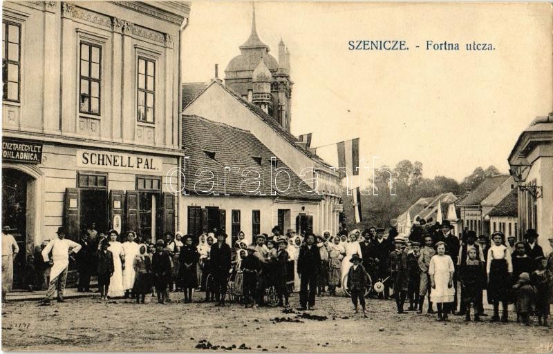 Leírás: Szenice, Szenicz, Senitz, Senica nad Myjavou; Fortna (Fortnya) utca, Pénztáregylet, Schnell Pál üzlete, magyar zászlók / street, shops, Hungarian flags, bank (EK)