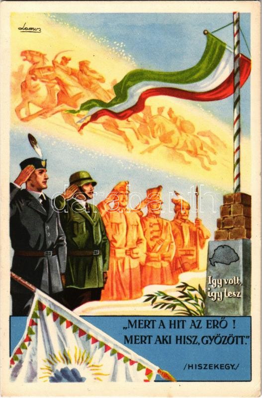Mert a hit az erő! Mert aki hisz, győzött. Hiszekegy. Kiadja az Ereklyés Országzászló Nagybizottsága / Hungarian irredenta propaganda, Hungarian flag, Trianon s: Lamoss (EK)