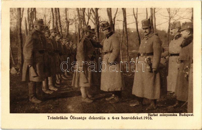 1916 Trónörökös Őfensége dekorálja a 4-es honvédeket. Herbst műnyomda / WWI Austro-Hungarian K.u.K. military, Charles I of Austria decorates the soldiers of the 4th Infantry Regiment + "M. kir. nagyváradi 4. honvéd gyalogezred" "Tábori Postahivatal 14"