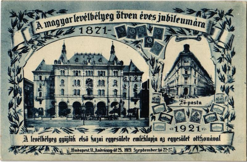 Budapest VI. Andrássy út 25. A magyar levélbélyeg 50 éves jubileumára kiadott emléklap, LevélbélyeggyűjtÅ‘k Egyesületének Otthona, FÅ‘ posta. 1648. számú lap (összesen 3000 darab készült) / The 50th anniversary of the Hungarian postage stamp, Stamp Collectors Association's home, main post office + "1871-1921 Magyar Postabélyeg EmlékkiállÃtás So. Stpl."