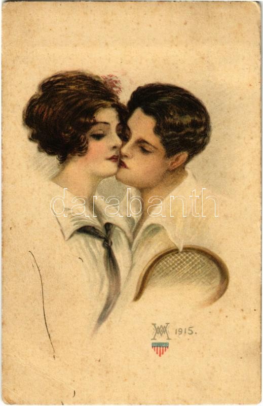 Leírás: 1916 A game for two. Alex Vincent's Kunstforlag. American Serie No. 10. Romantic couple, tennis racket, sport. artist signed (fl)
