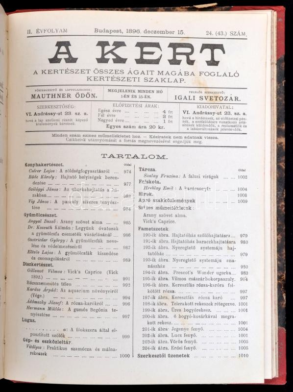 A kert. A kertészet összes ágait magába foglaló kertészeti szaklap. Főszerk és tulajdonos: Mauthner Ödön. II. Évfolyam 12. (31.)-24. (43.) sz. Bp., 1896. Fekete-fehér és színes műmellékletekkel és fametszetekkel. Félvászon kötésben egybekötve, intézményi bélyegzővel, volt könyvtári példány.