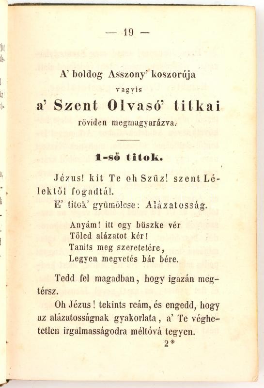 Zvornik János: Boldog asszony élő koszorúja vagy is az élő olvasó. Pozsony, 1844., Schmid Antal, 1 t.+120+1 p.+11 t. Kopott papírkötésben, intézményi bélyegzővel.