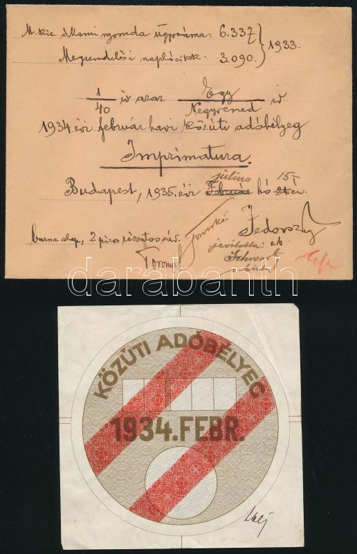 Leírás: 1934 Közúti adóbélyeg jóváhagyó minta kísérő levéllel