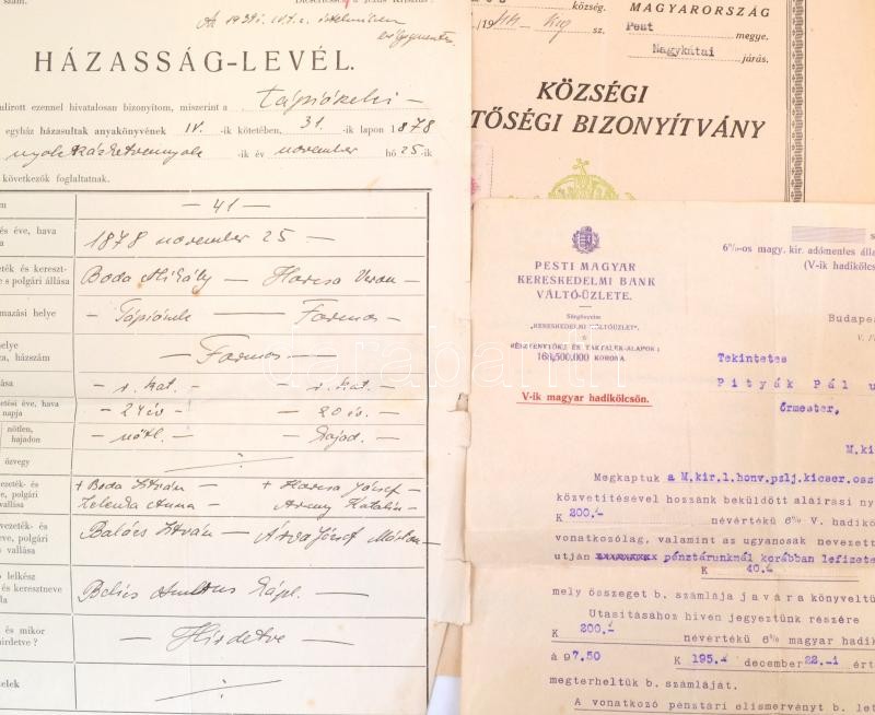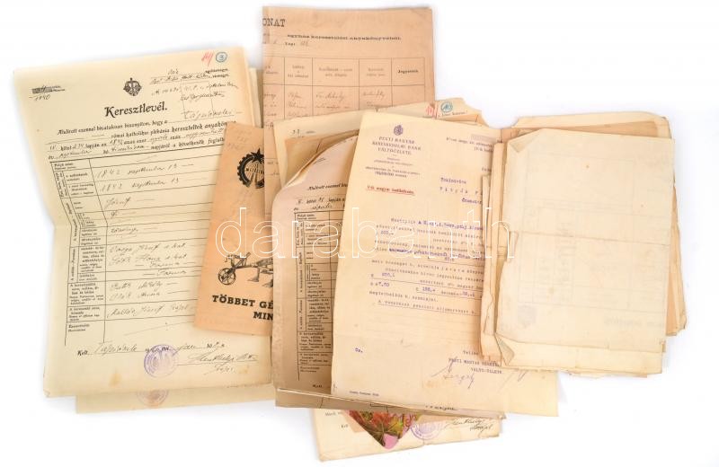 Leírás: cca 1880-1940 Kb 30 db okmánybélyeges irat. Anyakönyvi kivonat stb.